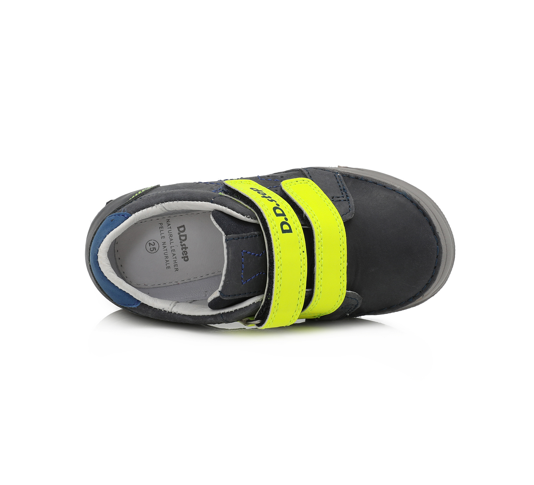D.D.Step cipő , kék színű neon sárga tépőzárral. Rugalmas talp, bőr felsőrész.